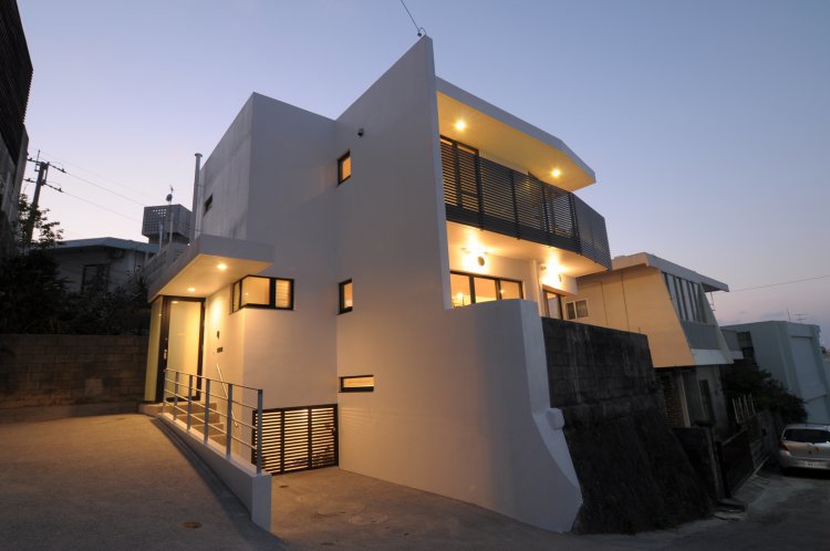 昔からある造成地に建て替えの当該物件。前面の道路がかなり急な為、駐車場を段々に。昔ながらの土留めをそのまま利用しているので、隣地とも段々。室内も中二階を造り段々に。
