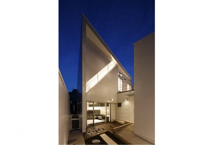 プラン上、斜めに分節した事はアトリエへの直射的に入射してくる太陽光を遮るためと、居住空間に快適な空間性と開放感を高めるためである。