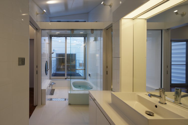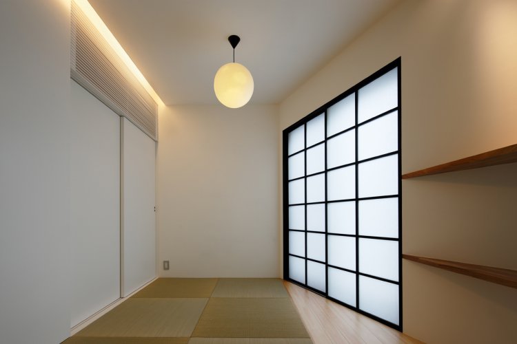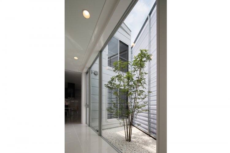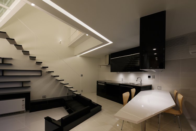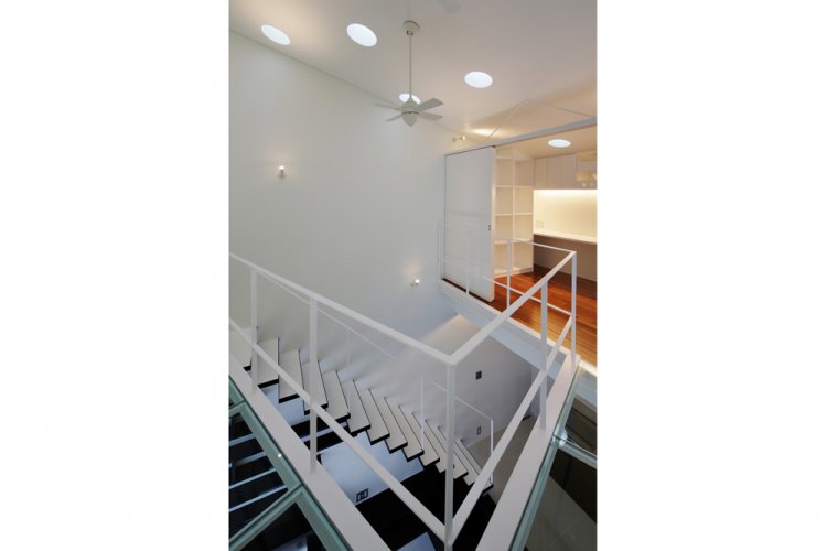 小さい建物ながら大空間を可能にするため構造体として鉄骨を多用した。居住空間の吹き抜け部分には大筋違いの構造体を利用し柔らかい太陽光により落ち着きのある空間を演出した。この光と相まってφ300の9つのトップライトが日々の暮らしに於いて時間の経過を感じさせてくれ光の入射により空間性に変化を与える。