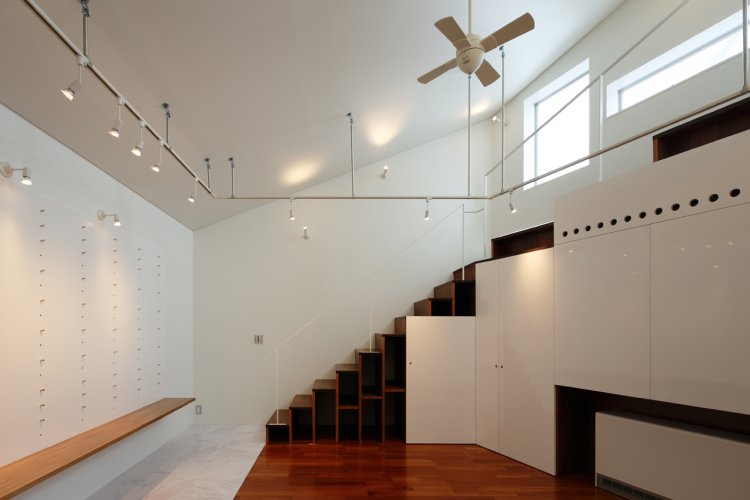 アトリエは執務スペースとして又はギャラリーとして利用可能な形態とした。キャンバス収納式の階段はギャラリーとしても使用できる。