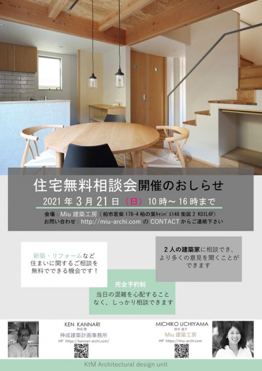 建築設計ユニットKtMの無料相談会を3月21日に予定しています。