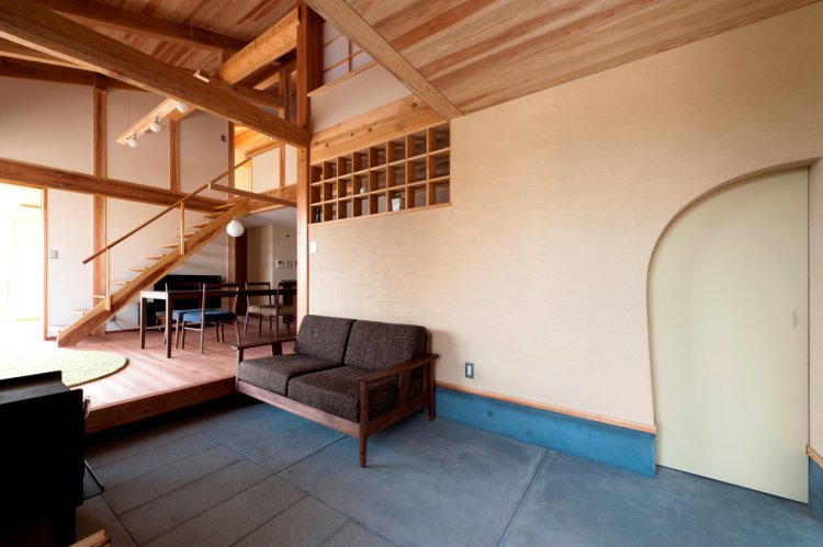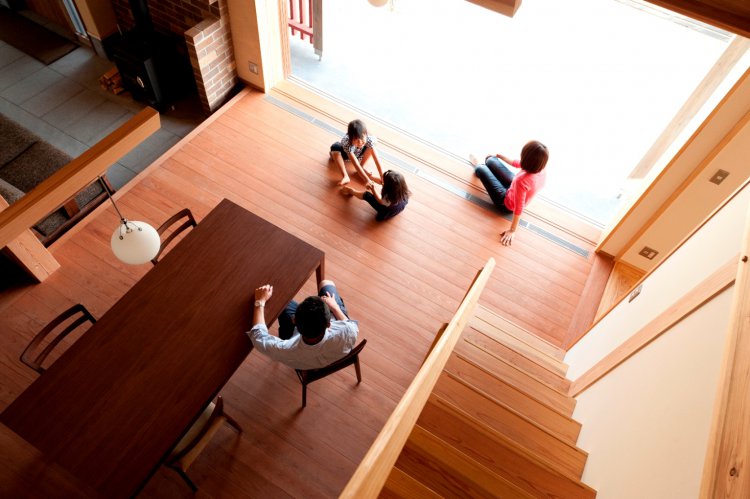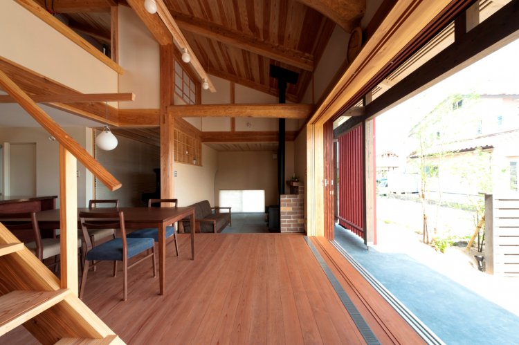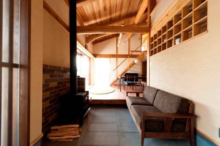 建物に入ると薪ストーブのある土間リビングがあり、家族やお客様を暖かく迎え入れます。
