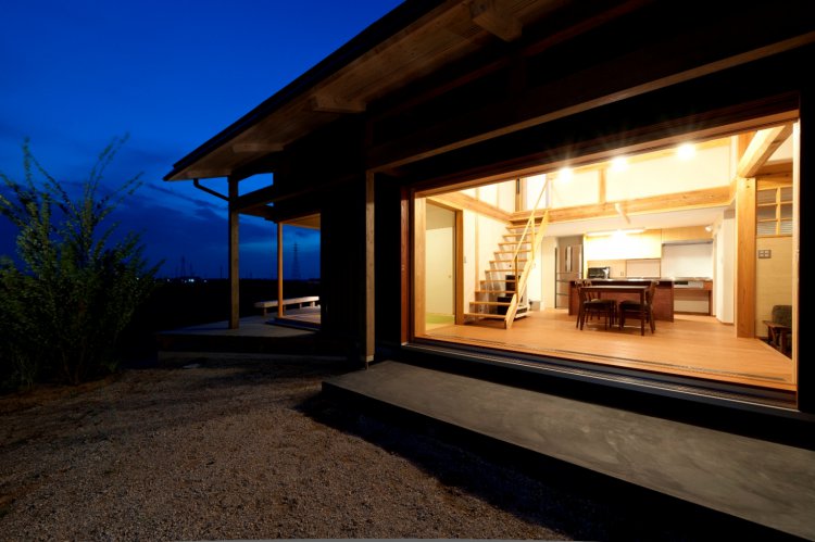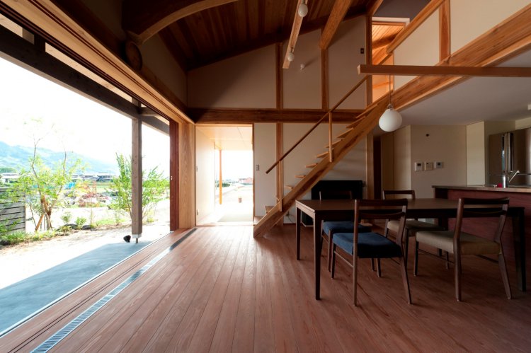 田園風景と耳納連山を望むのどかな場所に佇む片流れのシンプルな住まいです。