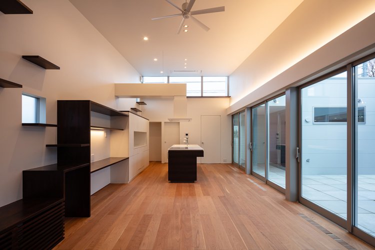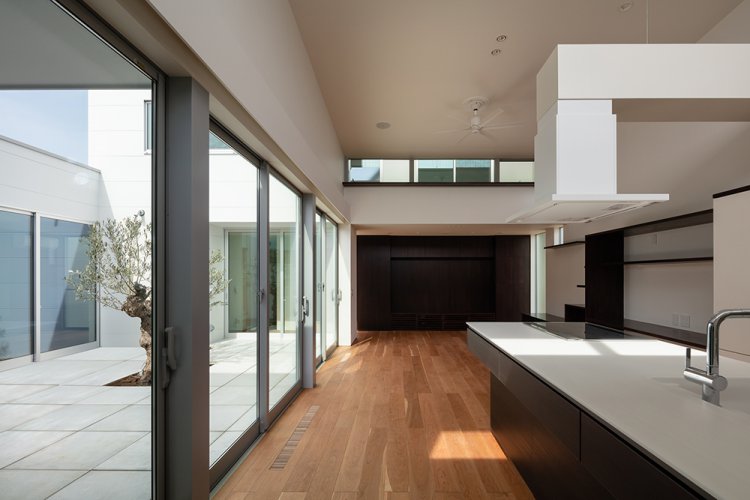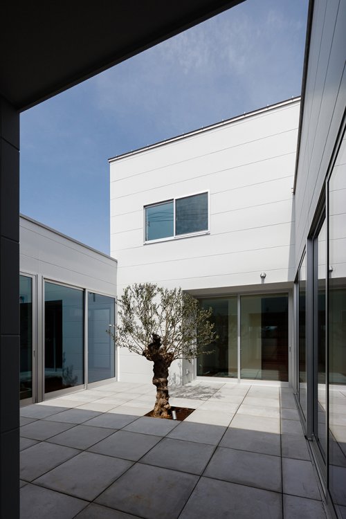 「家族それぞれの趣味と時間を大切にしながら、ペットとともに暮らす、機能的で収納に無駄のない、居心地の良い住まい」を家づくりのテーマとした4人家族とペット(犬・猫4匹)の住宅。新しく開発された住宅地の変化に対応できるように、プライバシーの守られた中庭に開いて光や風を取り込むコートハウスとすることで、将来にわたって居住環境が守られた生活を続けていくことを可能にしています。ペットも安心して遊べる中庭には建て主の方が見つけた古木オリーブが植わり、開放感とともに豊かな時間を日々の暮らしにもたらしてくれます。2階には二つの子供室とリビングからも見える猫テラスがあり、ペットも家族もそれぞれのお気に入りの場所でも楽しく暮らせる住まいになっています。[写真:大沢誠一/Archiplace]