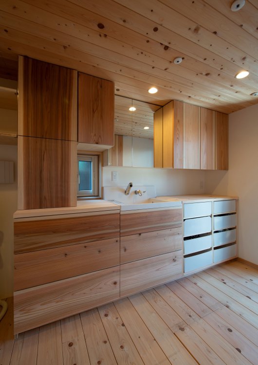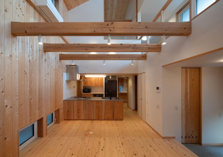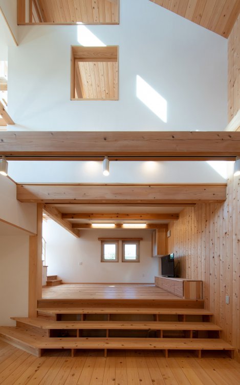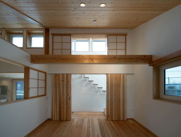 ・ダイニング上部吹抜けは2階各室と繋がり、日々の暮らしの中、家族の顔が見える空間 構成にしました。リビングの下は敷地の高低差も生かして10帖分の収納スペースをつくります。