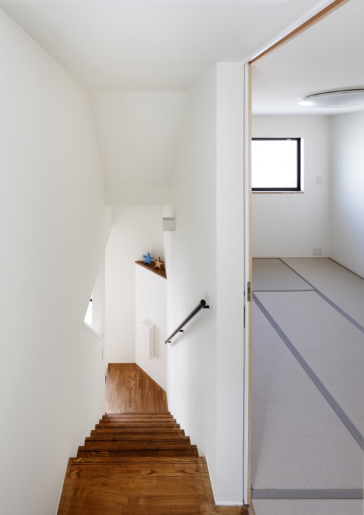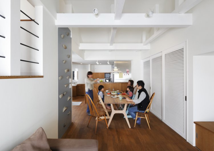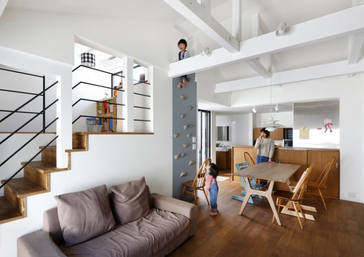 1階には水回りと各寝室。中2階に母専用のリビング。光庭に開かれたLDKは、子供室を兼ねるロフトと繋がる。また、元界壁にはボルダリングを施した。奥さんは「おもちゃがリビングに広がらないのが何より嬉しい」と言っている。