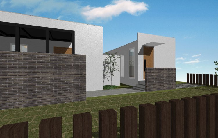 外部エントランスはタイルと鉄骨を採用し建物の白にアクセントを与えています。コの字型に建物を配置し、中庭を囲むような形にしています。