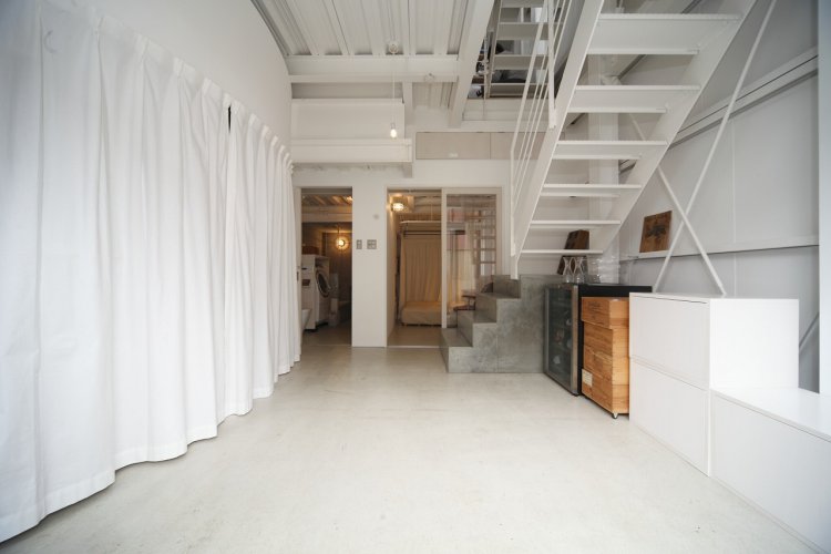 ワンフロア10坪足らずの空間を圧迫感を無くし緩やかに仕切る為カーテンを使っています。