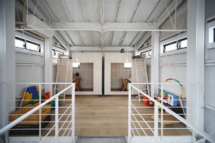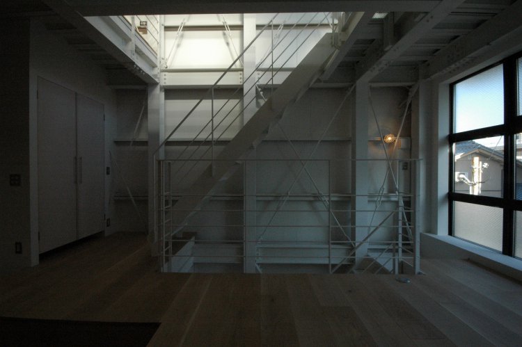 一方、内観は工場やワイン醸造所のような無骨なつくりがいいというイメージの共有ができていたので、鉄骨の構造部材(H鋼やブレース、胴縁)をあえて見せる仕上げとし白の塗装を施しています。