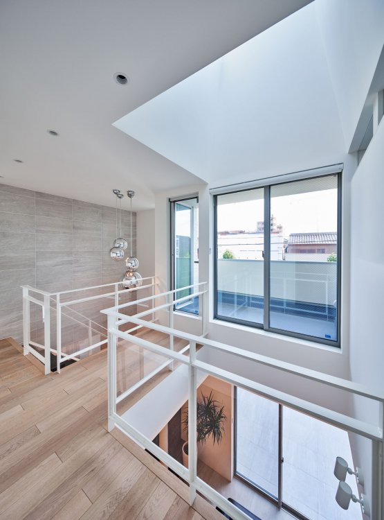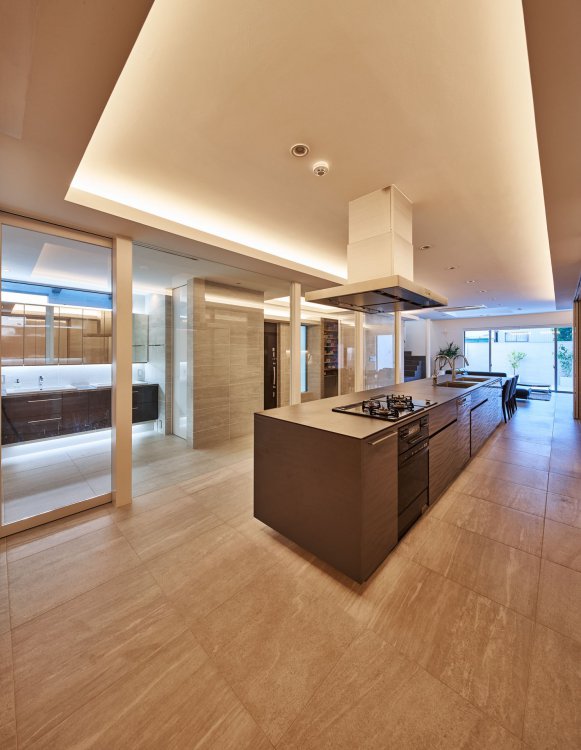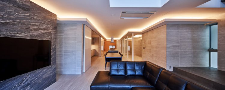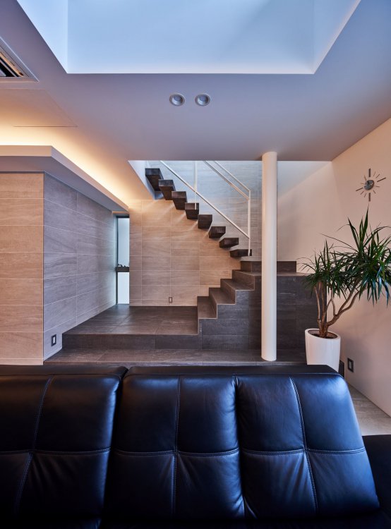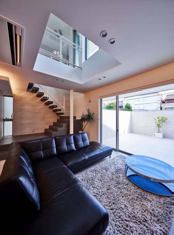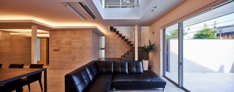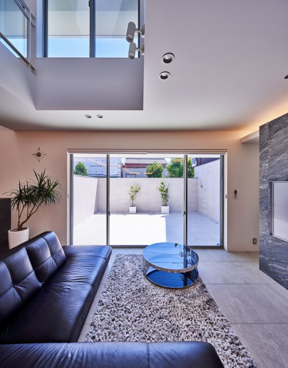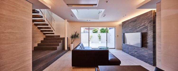前面道路の騒音や人の視線を防ぐために、御影石の壁を建てコートハウスとしてプライバシーを確保。内部床とテラス床の材料を合わせて視覚的な拡がりが得られ 自然を取り込む。上部から光を落として奥行のある空間に光をもたらし、明るく快適な住環境が実現された。