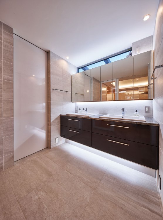 石・タイル・塗材等の素材を慎重に選択して、シンプルモダンな建物に質感と奥行をもたせた。