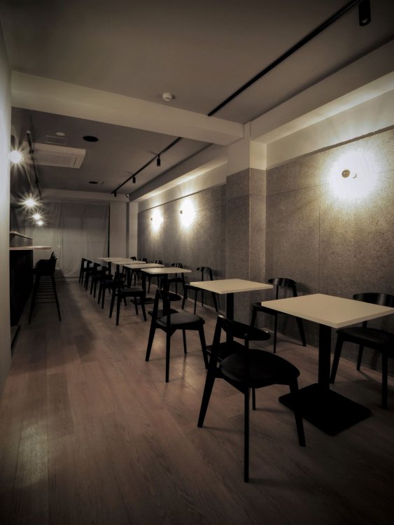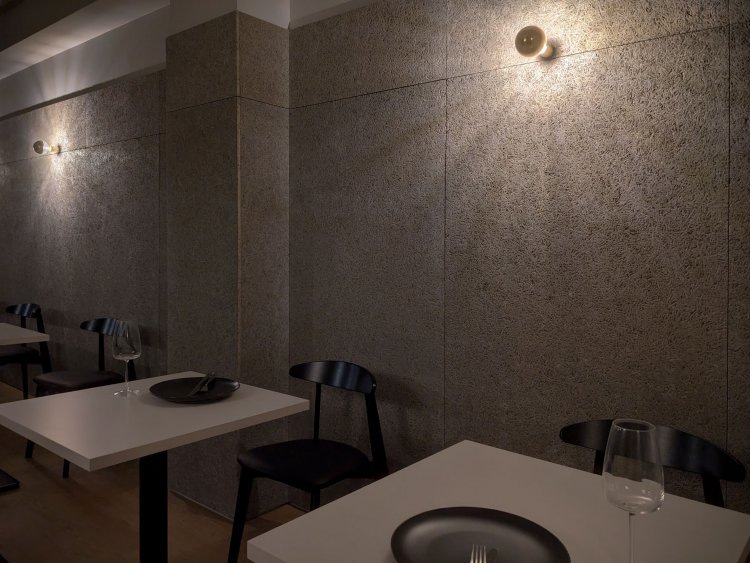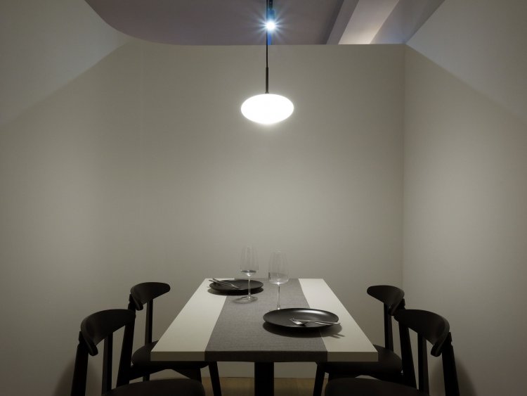 当レストランでは、異なる感じ方をする 2 つの空間を生み出しました。それぞれの空間は同じ場所にあるけれども違う感覚。玄関から引戸を開けて入る個室空間は、壁とテーブルを白で統一し、廊下を抜けて辿り着くホール空間は、壁へと降り注ぐブラケット照明が、それぞれ光の美しさを強調しています。