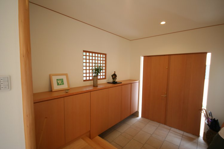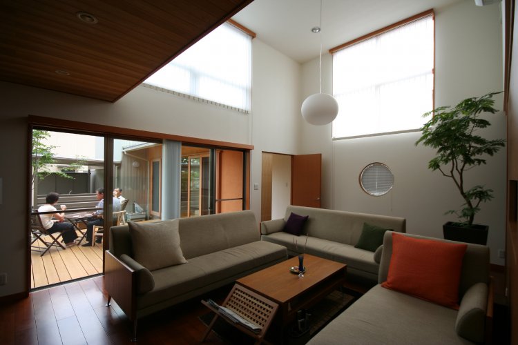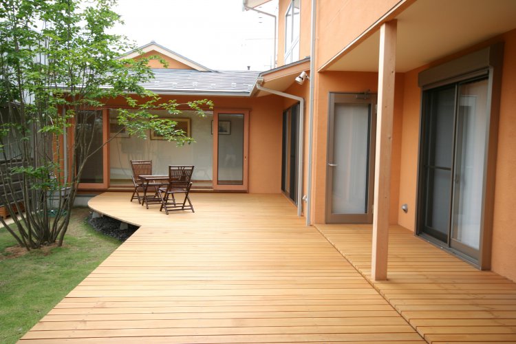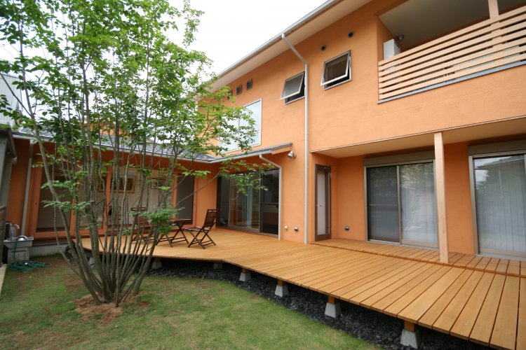 クライアントは今回の家造りにあたり、確固たるポリシーを持たれており、具体的な要望を含め何十項目に渡るメモを用意されていました。その要望を確実に理解した上で、プランとしては核となる2階建てゾーン(1Fリヒ゛ンク゛等・2F寝室等)をコートに面して配し、そこから2つの平屋ゾーンをコートを取り囲む様に派生させました。又、各ゾーンを連結させるメディアとしてアウターデッキを設け家族のコミュニティーの場とし、動線や心理的閉塞感の排除を試みました。各ゾーンの接続部よりコートとシンボルツリーを介し、さまざまな家の表情が楽しめ、思った以上の開放感とダイナミズムを喚起できたと思います。