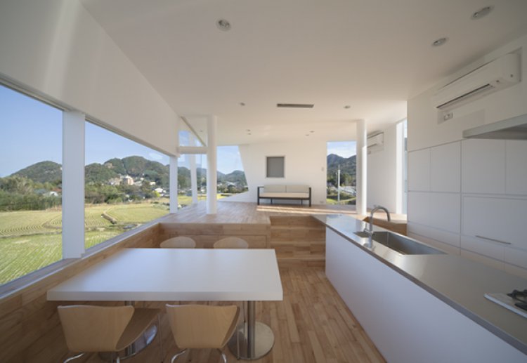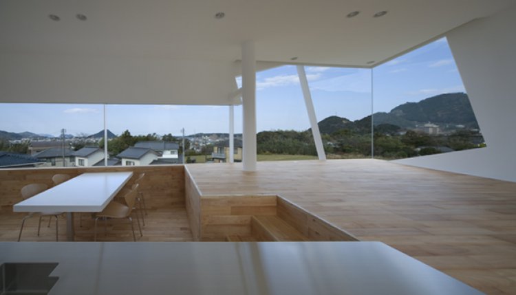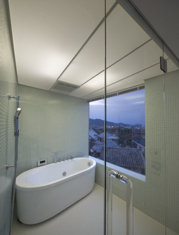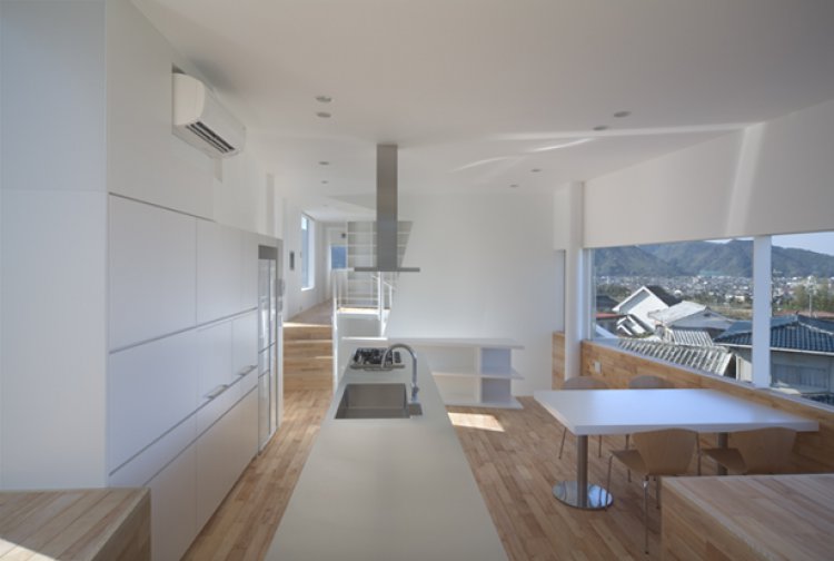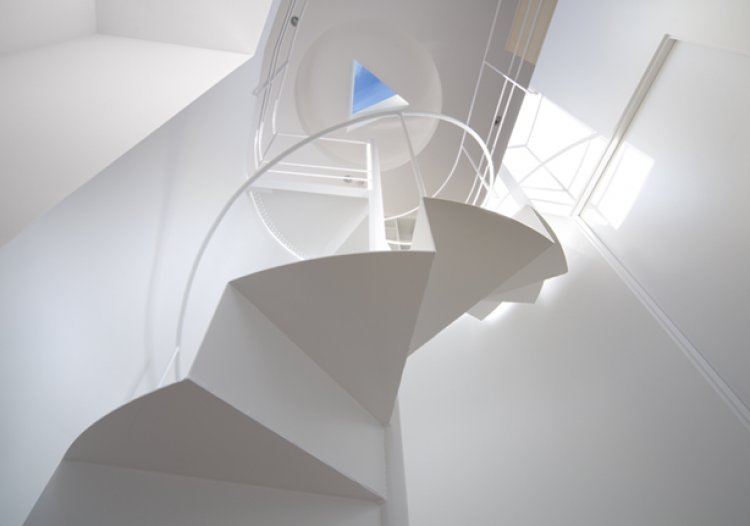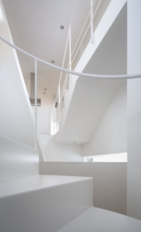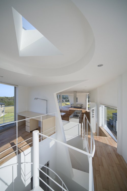 2階に対し少し振られて配置した1階のプライベートスペースには、一旦2階に上がり螺旋階段で下りなければならない。1階と2階では身体面と心理面でずれが生じ反転した関係になっている。そのことが1階のプライベート性、2階の開放性をより強めている。