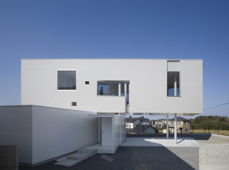 地上5mの高さから海を望める高台の分譲地。ピロティに3台分の駐車場と、安全面から敷地内で車の方向を変えるスペースを確保。