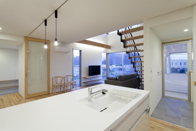 それを実現するため、プライバシーを保ちつつ、景色を楽しめ、採光、換気と十分に確保できるよう南面に大きな開口を設けた。建物自体はコンパクトだが、吹抜やロフト、開口部の位置などを工夫することで明るく開放的で広く感じる空間を構成した。玄関を開けたときにまず見えるのは庭へと続く気持ちのいい土間空間。コンパクトな空間の中にそれぞれの場面を楽しめるよう工夫した。
