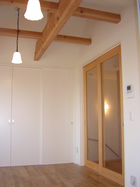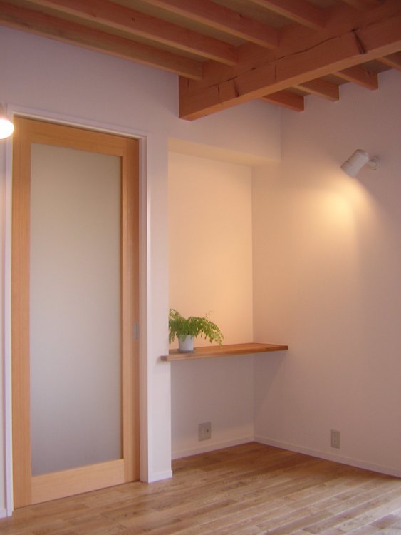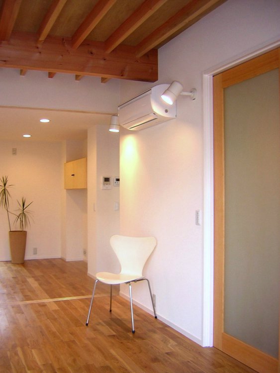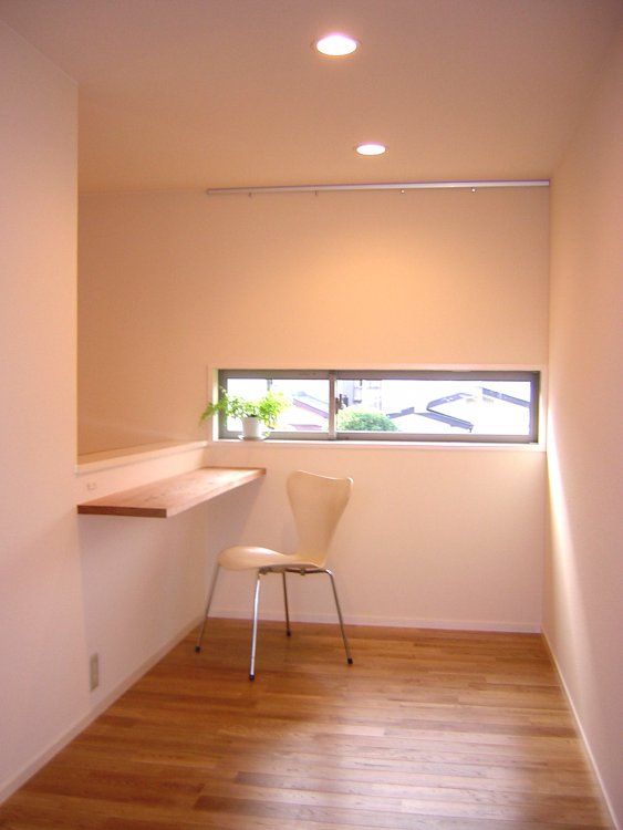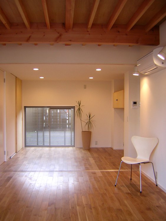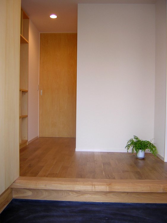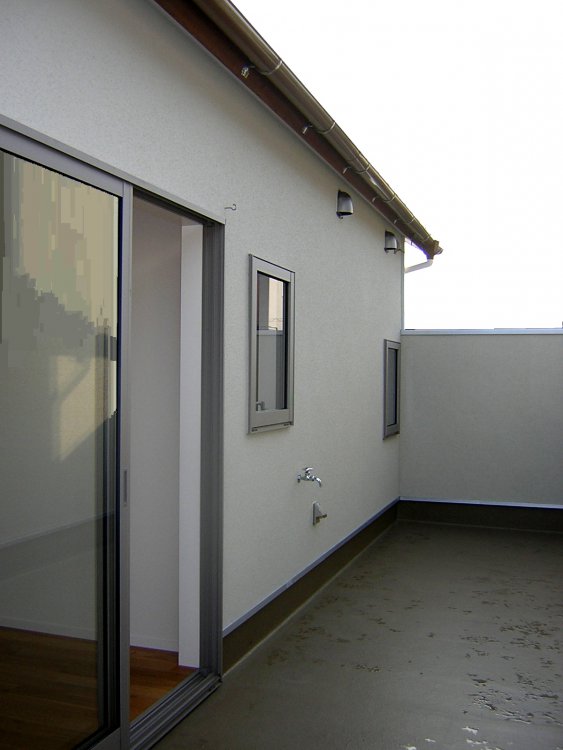 数十年前に開発された郊外の「小さな敷地」が密集した住宅地域で、車2台の駐車場を確保しながら、いかに潤い感「密集した住宅地域の中のオアシス」のある住宅にするかがテーマでした。建築主の「植栽等は自身で行いたい」との希望で、植栽を植えるスペースだけを建物の周りに確保しました。バルコニーも含めて、現在ははGREENで溢れています。駐車場もタイヤが嵌らない大きさでコンクリートにスリットを入れて、スリットにも下草等のGREENがあふれています。