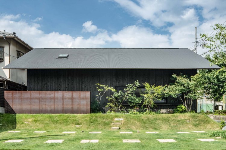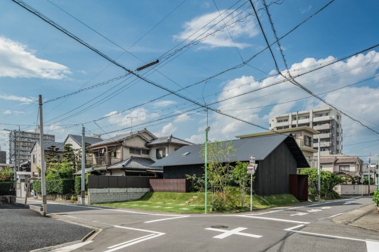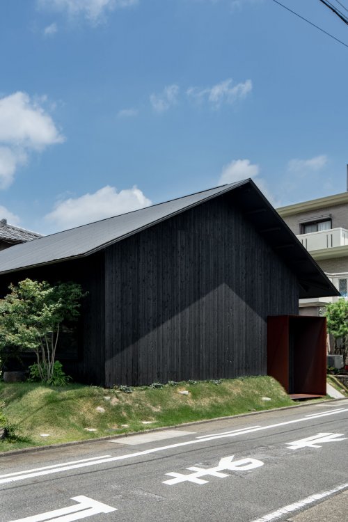 閑静な住宅地の周囲に圧迫感が出ないように外壁に焼杉を使い、舞台上にいる黒衣(くろこ)のような