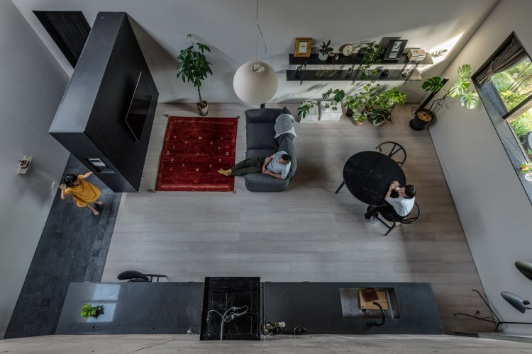 内部は木造の箱の中にコンクリートの箱を入れ込み、団欒・水回り・プライベートスペースの3層に分けた。さらにそれらのスペースを天井やガラスでつなぐことで、室内のどこにいても家族の気配がわかるように空間をつなげ、いつまでも心豊かに生活できるように計画をした。