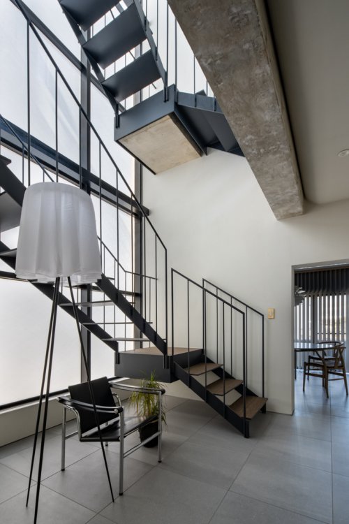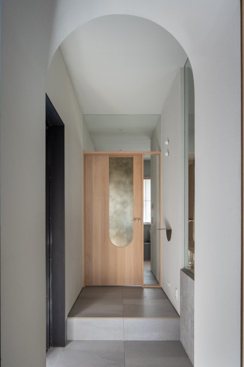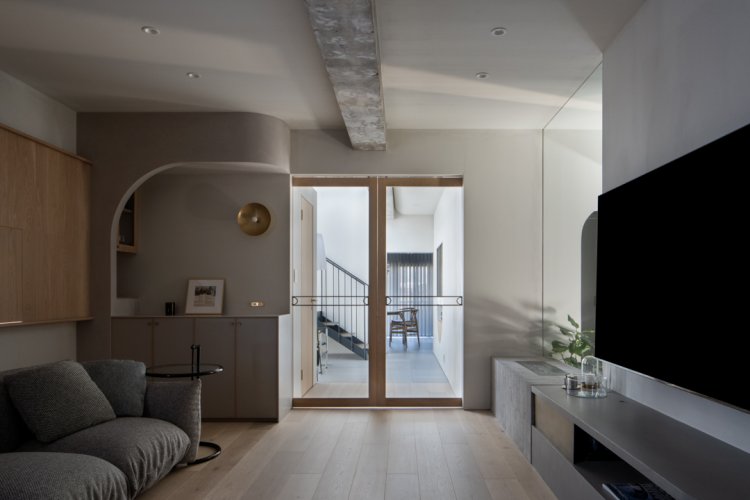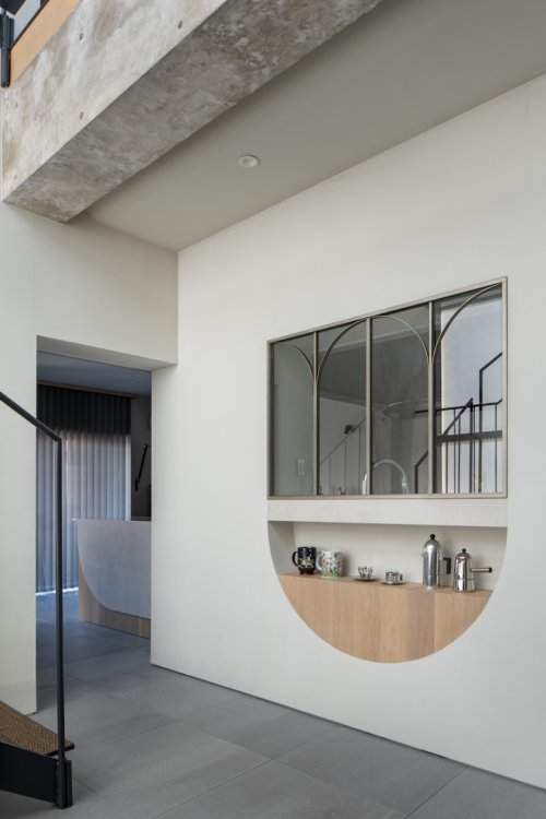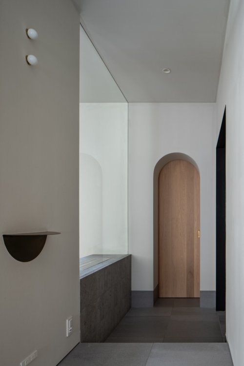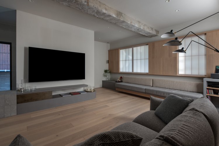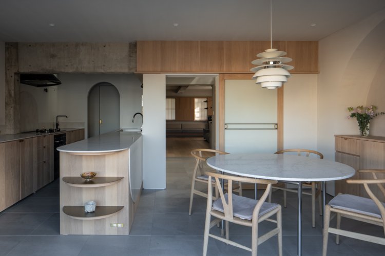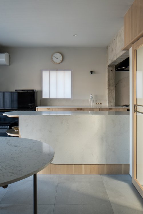 しっくい・オークなどの柔らかい印象のマテリアルとコンクリート・石・鉄などの固い印象のマテリアルを調和させて、空間にのびやかな繋がりがでるようにした