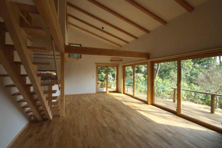 内部は自然素材で仕上げ、ワンルームのような構成で家族の気配が感じられます。風通しも良く、高断熱、床暖房等で快適な住環境になっています。
