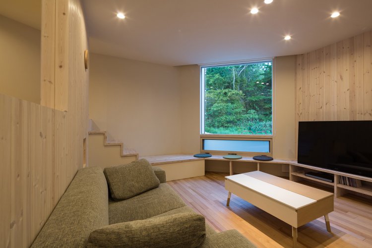 3方道路の敷地なため、プライバシーを保ちながらも近隣の森を上手く室内に切り取って借景とできるよう開口部の設計をしています。