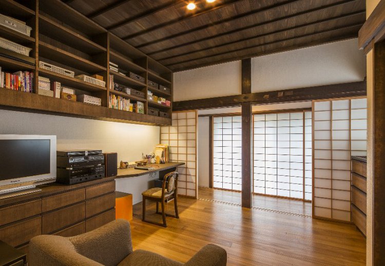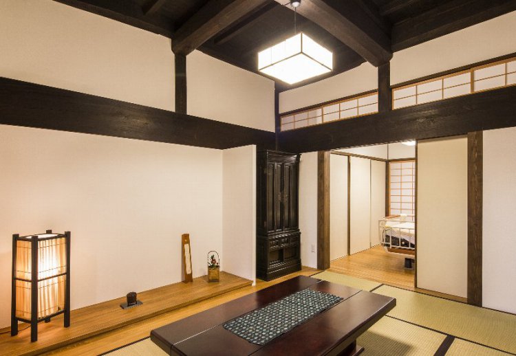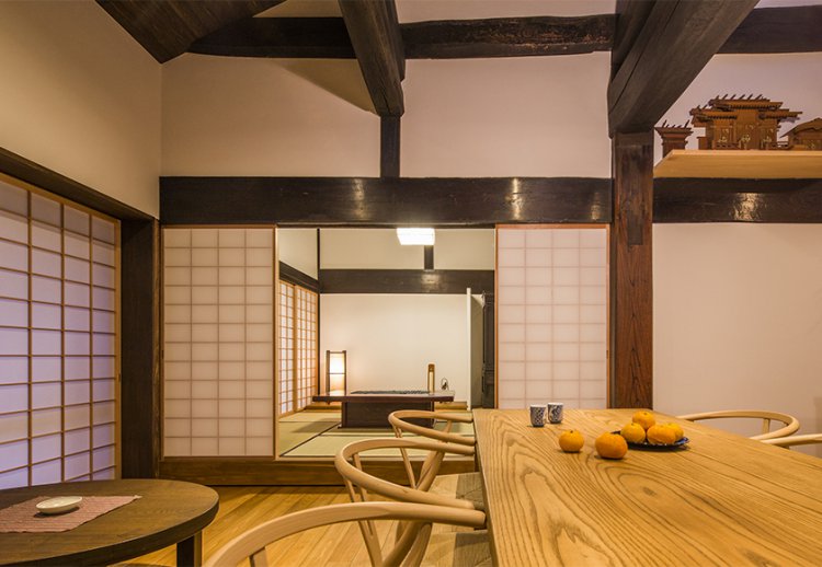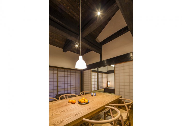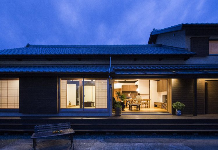 土間に田の字型の和室が配置された典型的な古民家を、祖母、親世帯、子世帯が暮らす住まいに増改築しました。土間部分を家族が集まる居間食堂キッチンに改修して、田の字の和室側を祖母と親世帯の住まいに、土間の反対側に新たに子世帯の住まいを増築しています。